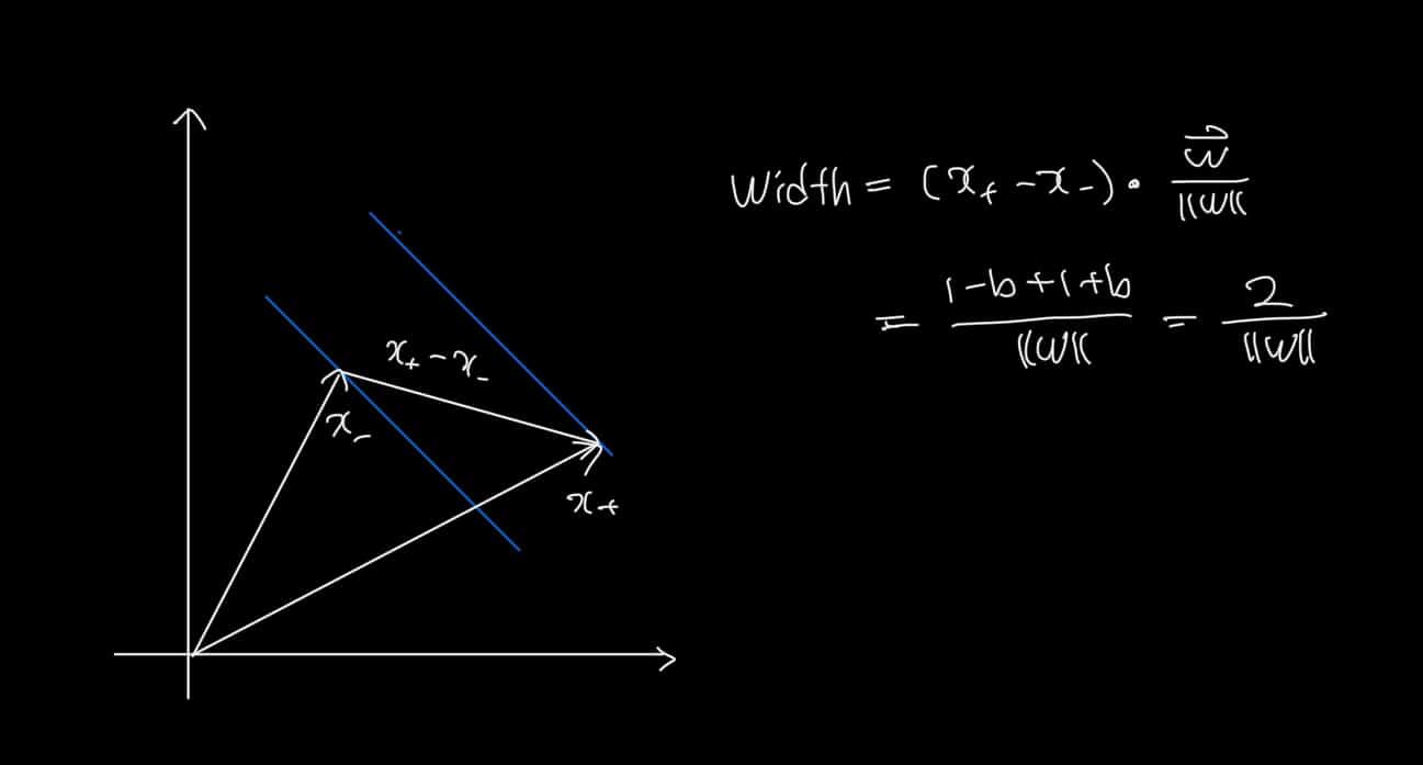 다시 처음으로 돌아와서, 우리는 마진이 최대가 되기를 원한다. 만약 초평면과 수직한 Unit Vector가 있고 다른 클래스에 속하는 Support Vector를 각각 하나씩 안다면 점선 사이의 너비를 구할 수 있다.